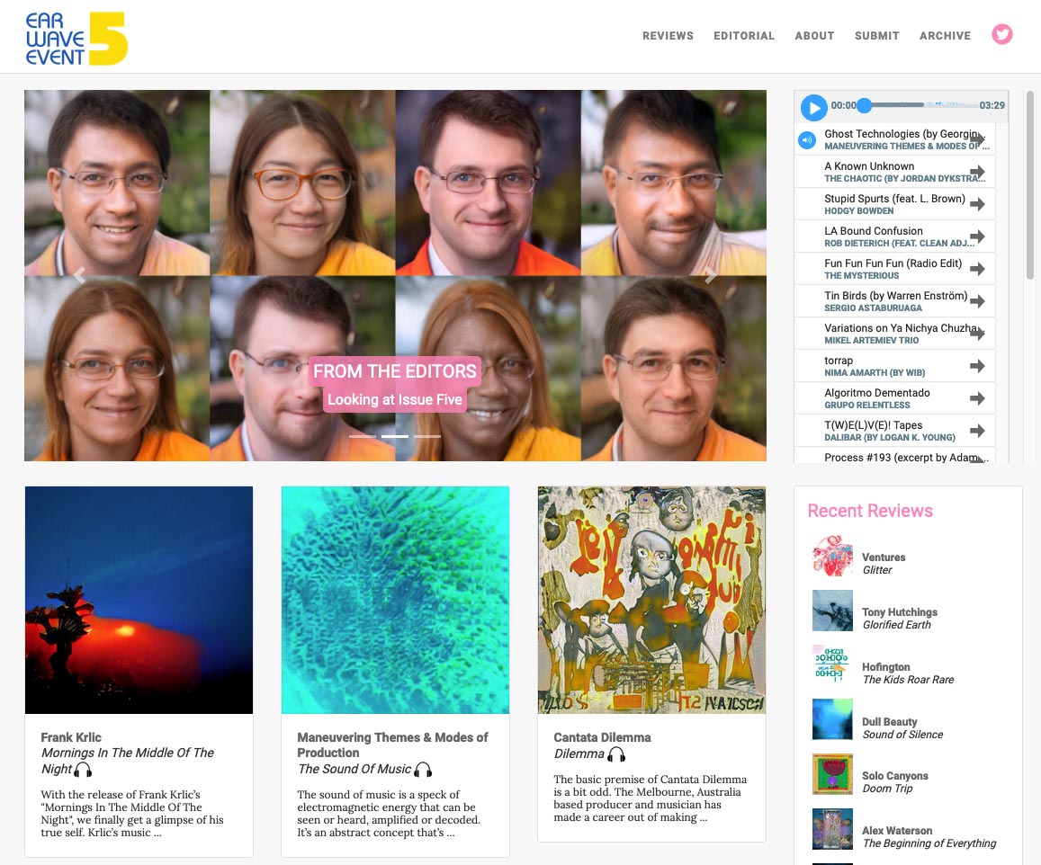A 'fake' music review website entirely written by AI (using GPT-2). I trained the AI to generate reviews of non-existent albums, and in turn, artists submitted new music based off of these imagined albums.